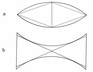Prismas, toda lente oftálmica seja ela convergente ou divergente, é composta de dois prismas ligados por seua ápices ou seus extremos, ou seja, uma lente convergente ( positiva ), tem seu poder dióptrico mais acentuado em seu centro óptico no lugar onde seus prismas se encontram, na figura temos como exemplo "a" uma lente convergente e "b" uma lente divergente, a diferença está nas bases dos prismas, na convergente a união se faz no centro e na divergente as bases dos prismas se encontram nas bordas.