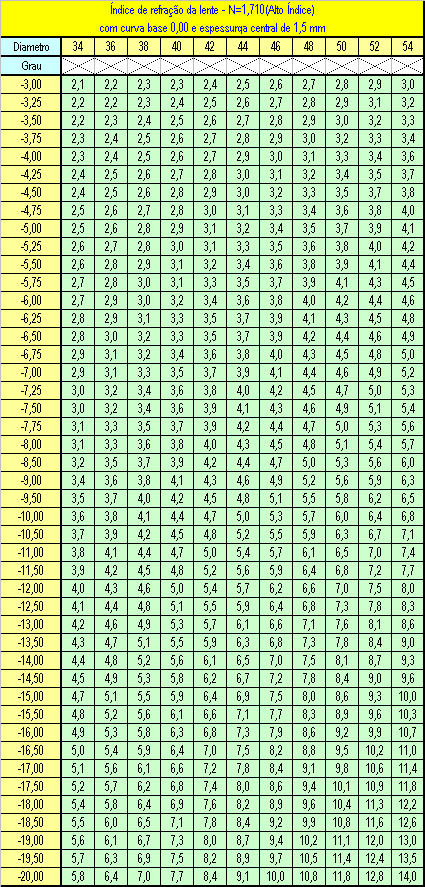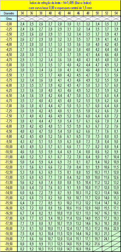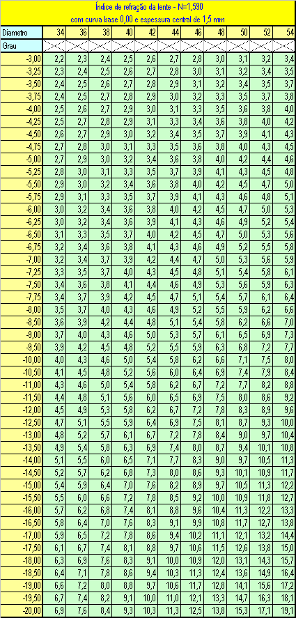 Segundo Ney Dias as espessuras de lentes negativas, devem ser dominadas pelos consultores quando questionados sobre os valores das mesmas, geralmente os mais preocupados com as tais “bordas” são os míopes, pois são nestes casos que as bordas ficam mais aparentes e mais difíceis de esconder na armação, em alguns casos se fazendo preciso a surfaçagem de uma lenticular ou até mesmo uma parabólica. Ney Dias nos apresenta tabelas que nos mostram com exatidão as espessuras de bordas em lentes negativas, ou divergentes como preferirem, em diferentes materiais e diâmetros, seguem as tabelas. Para Cr39 com índice de 1.499.